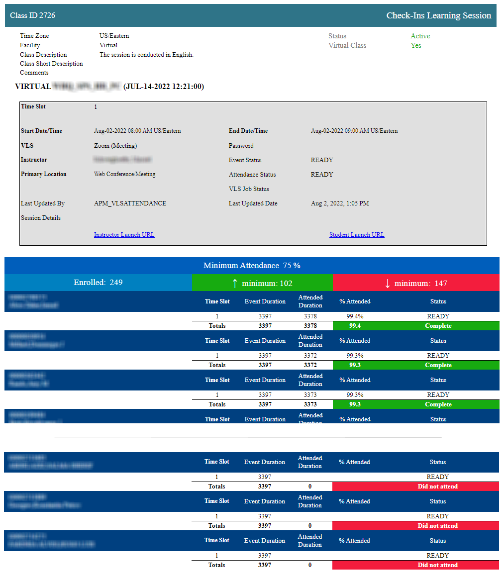 This report is designed to help monitor and track classes that are setup with your integrated VLS (Teams, Zoom, WebEx) system. The report provides visibility on the Class details, including all Segments. It also provides the details on who attended each segment, how long they attended and if they met the minimum attendance threshold. The report also provides what credit was provided to each person.
