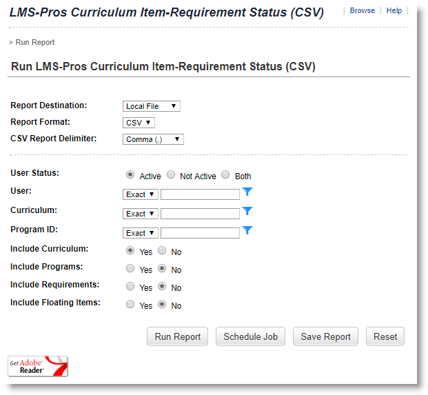 The Curriculum Item-Requirement Status report is a simple to use report that helps you track the status of student assigned Curricula and Programs. This report provides progress data for Items, Requirements and Requirement Groups contained within a Curriculum and Programs. This package includes 2 reports. One for the LMS Administrators and a second that you can make available to Supervisors.