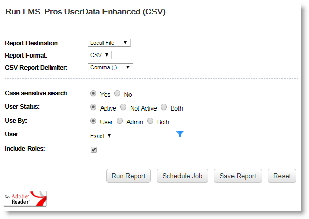 The User Data Enhanced report returns almost every attribute for your employee and administrator accounts. You can verify the Administrator and Instructor roles associated to each account, as well as verify the preferences (Language, Date/Time format, etc...) set for each account. This report also provides all your custom columns in a linear view making it easier to filter. Plus much more...